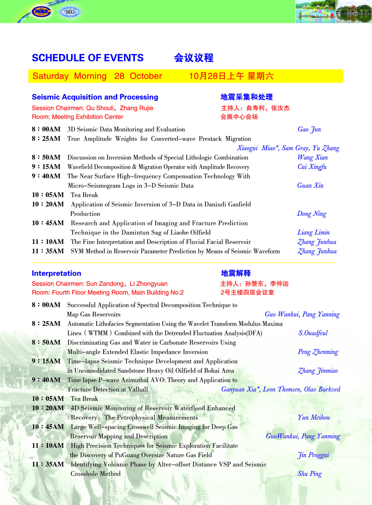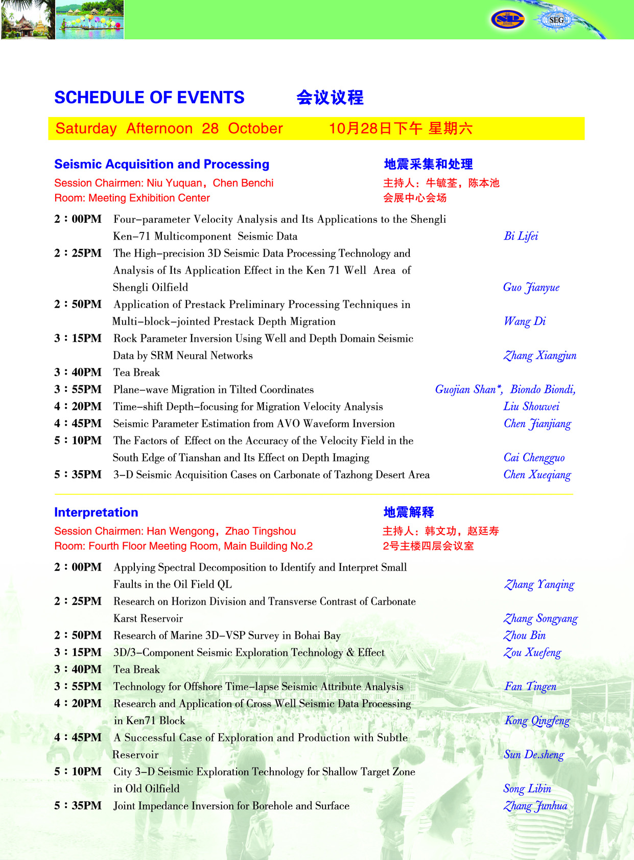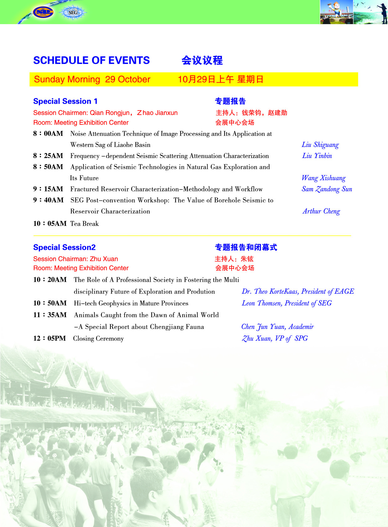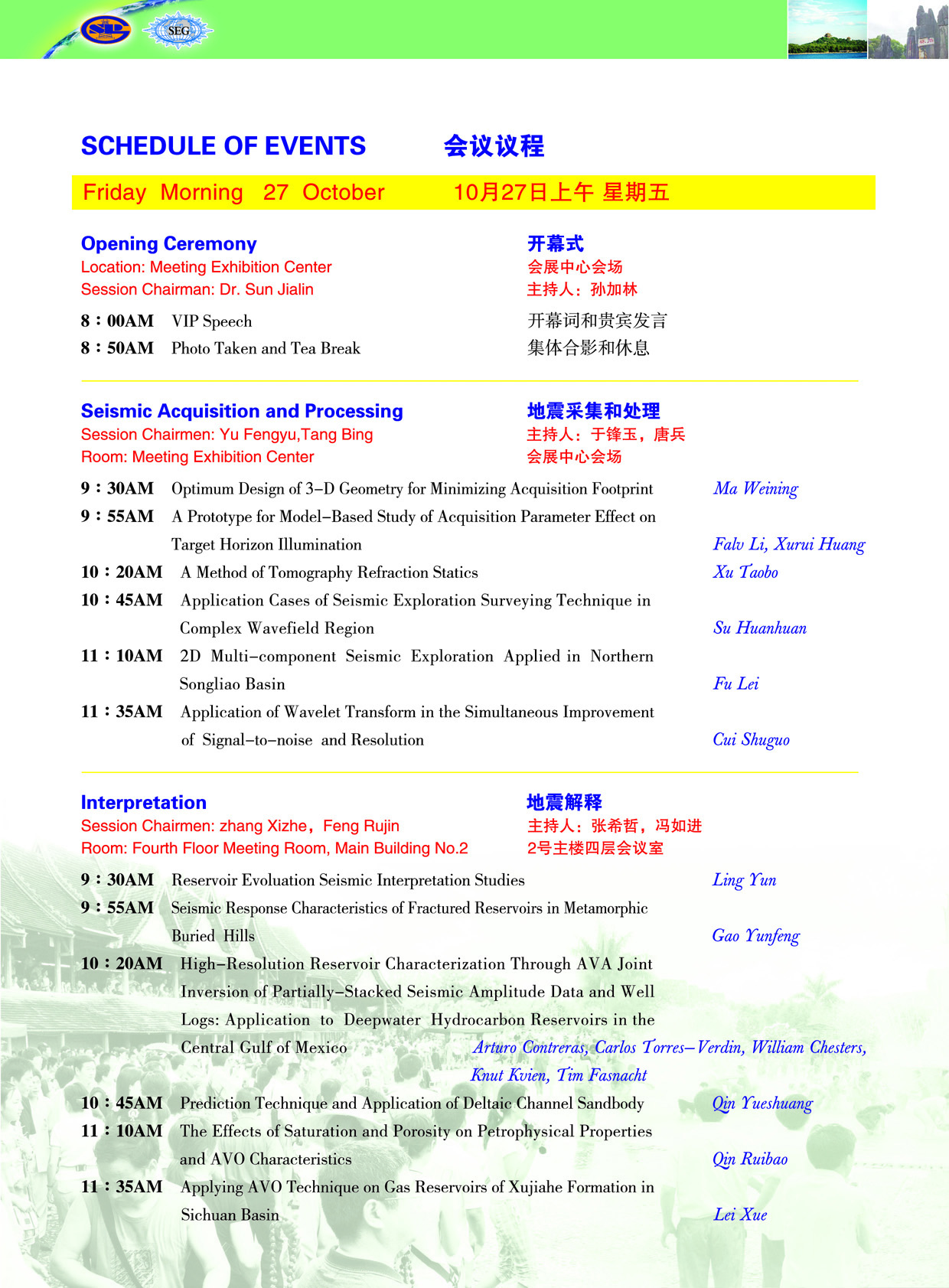“2006年SPG/SEG昆明国际地球物理会议”报告发言次序见附件,请参加会议报告人须于26日将发言多媒体资料送交阳光海岸酒店主楼202房间,酒店内电话2202。由于个别报告人未到会,每个报告顺序可能提前,请报告人注意报告时间的调整。(如果附件直接打不开,可先将附件下载后再打开.)