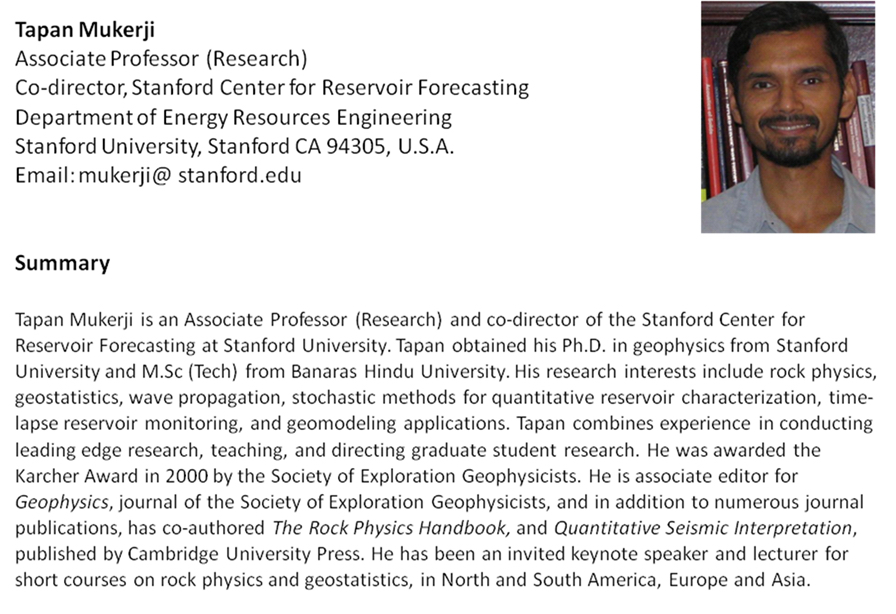 由于讲师Gary Mavko教授此次不能来中国授课,培训课程将由其同事Tapan Mukerji教授讲授,Tapan Mukerji教授简历见附件或登陆斯坦福大学网站(http://pangea.stanford.edu/)查看。培训其他事宜不变,特此通知。